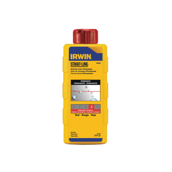 Irwin Marking Chalk – Red 8 oz is a powder-form marking chalk supplied in a refill bottle. This product is designed for the layout and marking materials category and is suitable for use with chalk line reels and hand chalkers.